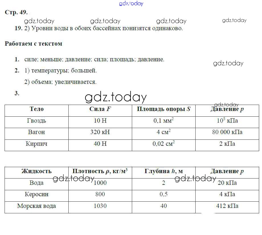 На страницах сайта gdz.today вы найдете учебный и вспомогательный материал, направленный на улучшения знаний школьной программы. ГДЗ - онлайн мир знаний Решение к главе 5. Давление твёрдых тел, жидкостей и газов стр.49 Тетради-тренажеру по Физике для 7 класса Артеменков, Белага Просвещение Сферы 2016