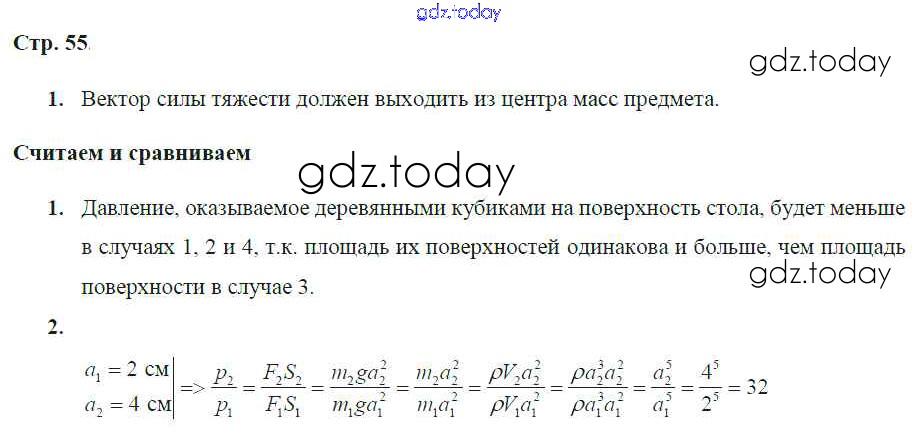 На страницах сайта gdz.today вы найдете учебный и вспомогательный материал, направленный на улучшения знаний школьной программы. ГДЗ - онлайн мир знаний Решение к главе 5. Давление твёрдых тел, жидкостей и газов стр.55 Тетради-тренажеру по Физике для 7 класса Артеменков, Белага Просвещение Сферы 2016