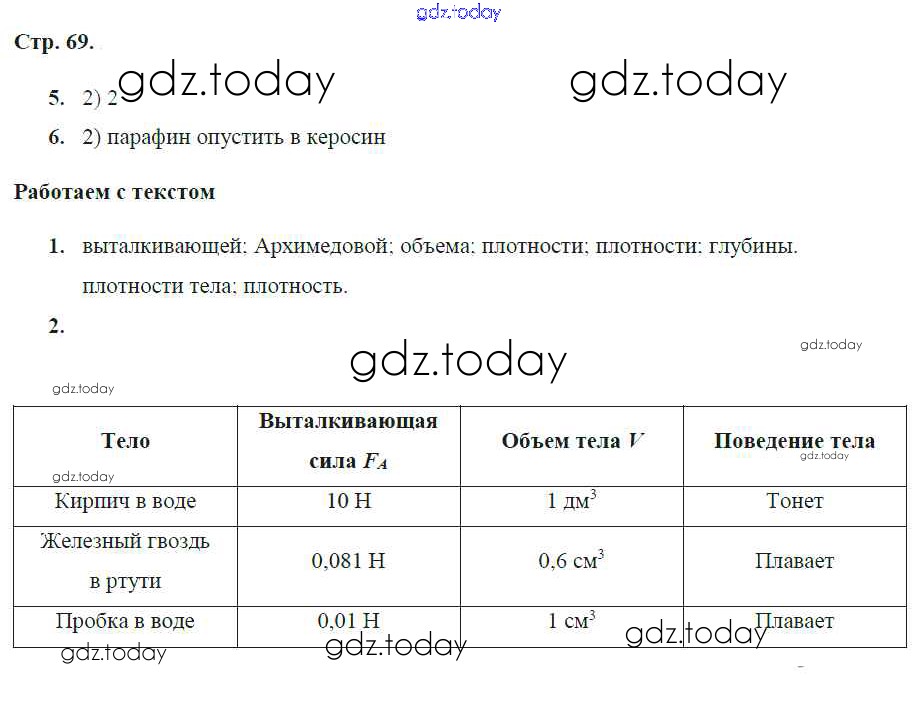 На страницах сайта gdz.today вы найдете учебный и вспомогательный материал, направленный на улучшения знаний школьной программы. ГДЗ - онлайн мир знаний Решение к главе 7. Закон Архимеда. Плавание тел стр.69 Тетради-тренажеру по Физике для 7 класса Артеменков, Белага Просвещение Сферы 2016