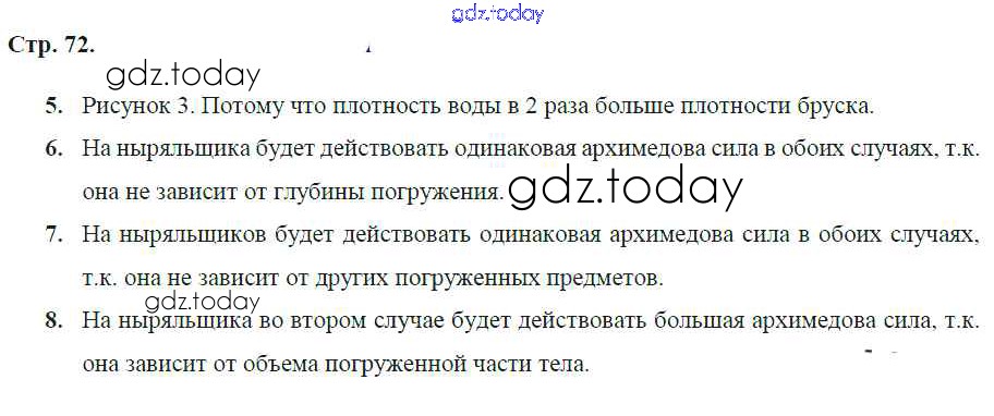 На страницах сайта gdz.today вы найдете учебный и вспомогательный материал, направленный на улучшения знаний школьной программы. ГДЗ - онлайн мир знаний Решение к главе 7. Закон Архимеда. Плавание тел стр.72 Тетради-тренажеру по Физике для 7 класса Артеменков, Белага Просвещение Сферы 2016