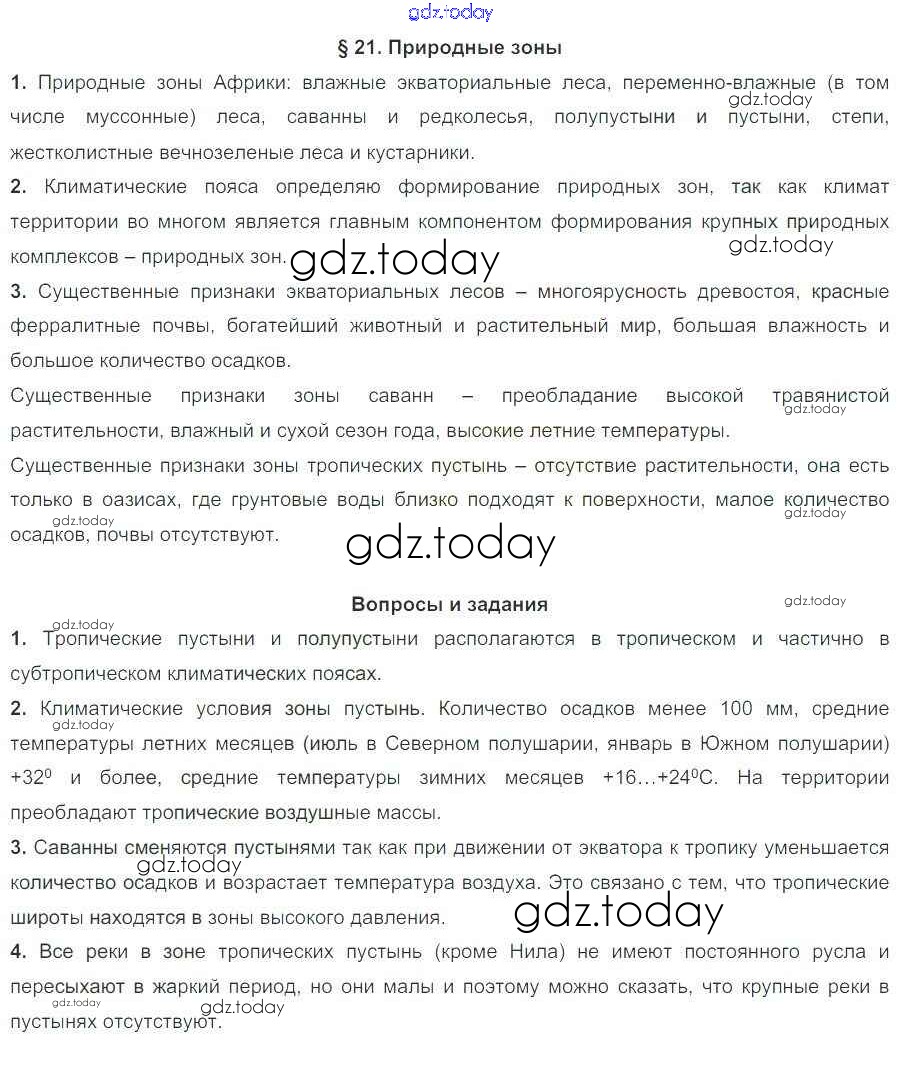На страницах сайта gdz.today вы найдете учебный и вспомогательный материал, направленный на улучшения знаний школьной программы. ГДЗ - онлайн мир знаний Решение к параграфам 21 Учебнику по Географии для 7 класса Коринская, Душина Дрофа 2017