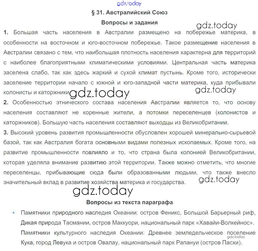 На страницах сайта gdz.today вы найдете учебный и вспомогательный материал, направленный на улучшения знаний школьной программы. ГДЗ - онлайн мир знаний Решение к параграфам 31 Учебнику по Географии для 7 класса Коринская, Душина Дрофа 2017
