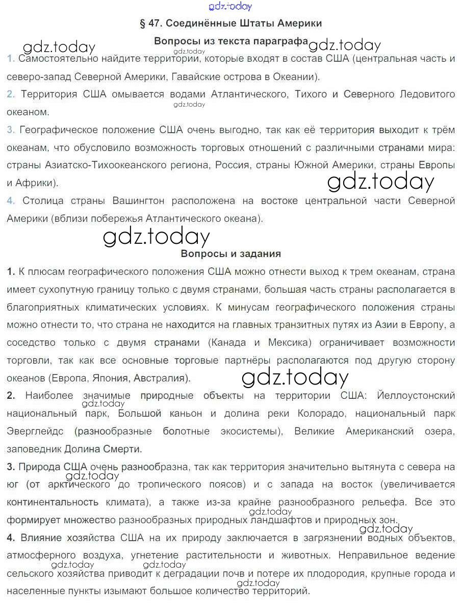 На страницах сайта gdz.today вы найдете учебный и вспомогательный материал, направленный на улучшения знаний школьной программы. ГДЗ - онлайн мир знаний Решение к параграфам 47 Учебнику по Географии для 7 класса Коринская, Душина Дрофа 2017