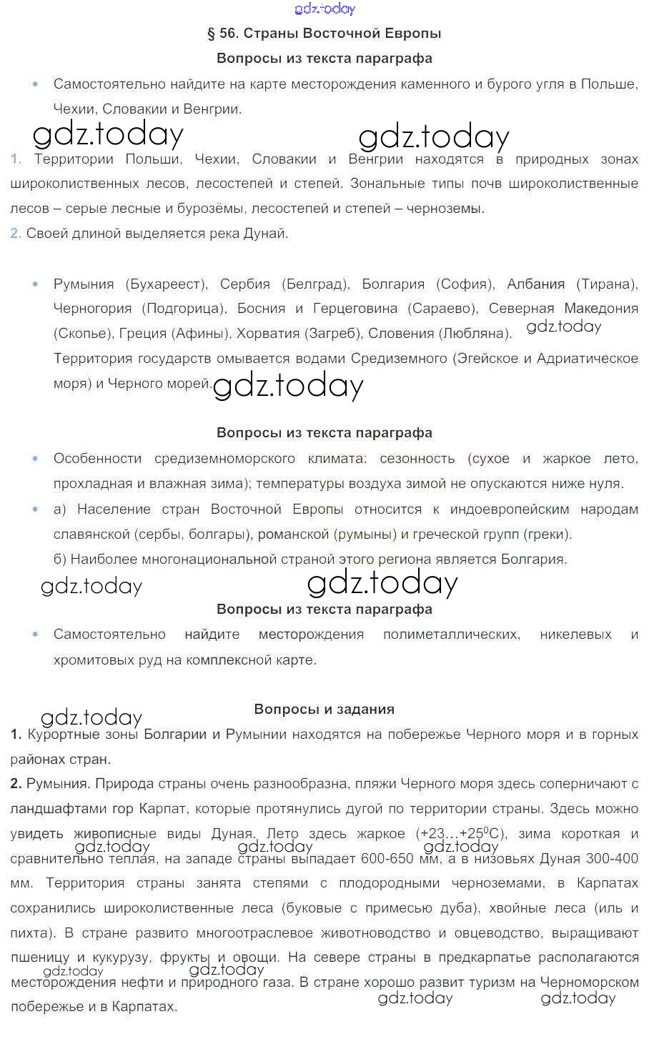 На страницах сайта gdz.today вы найдете учебный и вспомогательный материал, направленный на улучшения знаний школьной программы. ГДЗ - онлайн мир знаний Решение к параграфам 56 Учебнику по Географии для 7 класса Коринская, Душина Дрофа 2017
