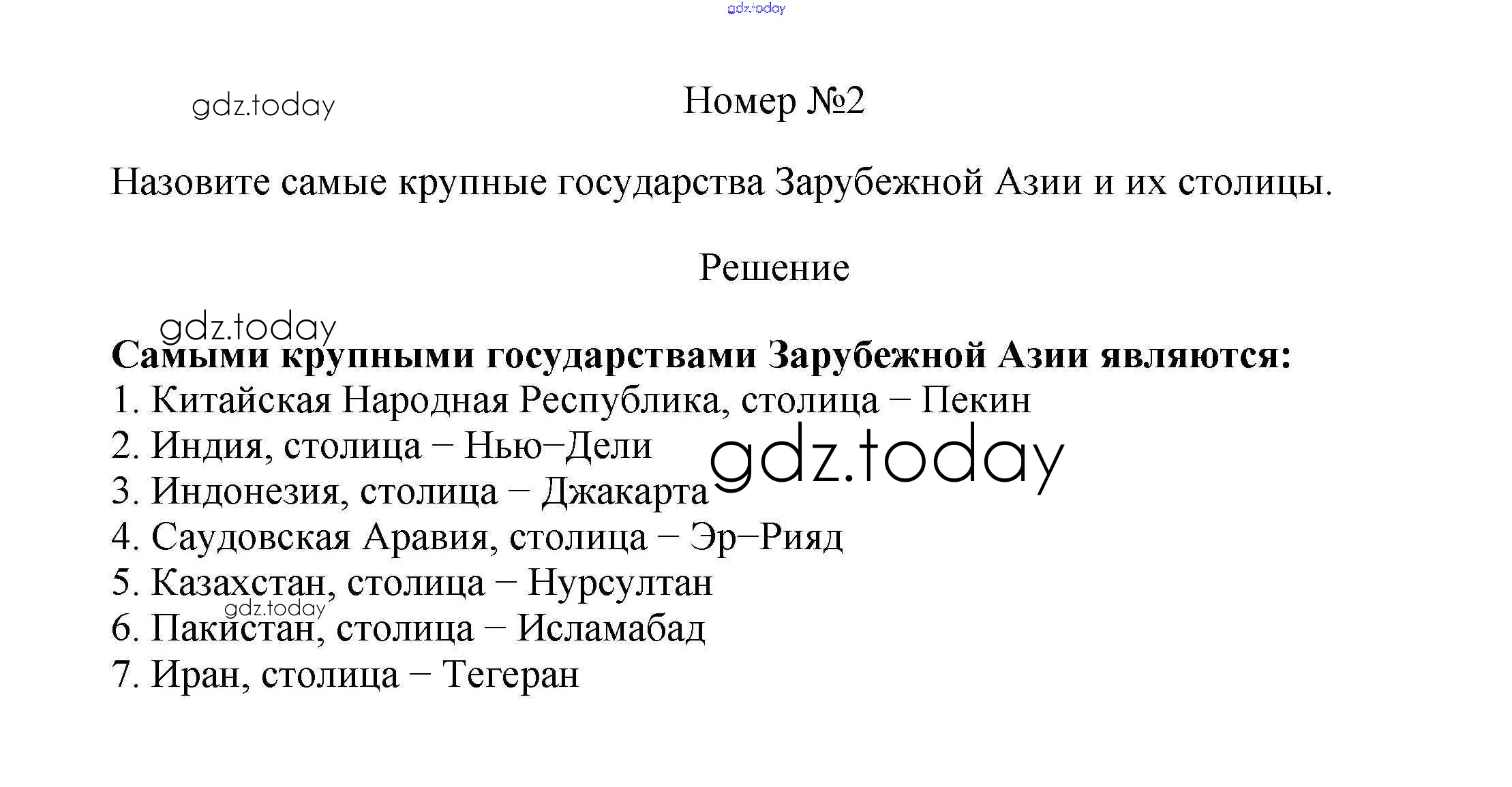 На страницах сайта gdz.today вы найдете учебный и вспомогательный материал, направленный на улучшения знаний школьной программы. ГДЗ - онлайн мир знаний Решение к §52. Азия в мире 2 Учебнику по Географии для 7 класса Алексеев, Николина Просвещение Полярная звезда 2022