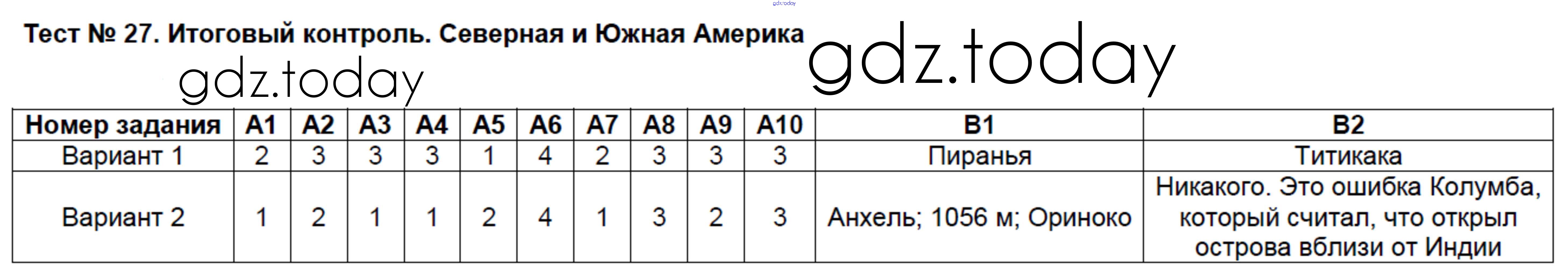 На страницах сайта gdz.today вы найдете учебный и вспомогательный материал, направленный на улучшения знаний школьной программы. ГДЗ - онлайн мир знаний Решение к тестам 27 Контрольно-измерительным материалам (КИМ) по Географии для 7 класса Жижина ВАКО 2017