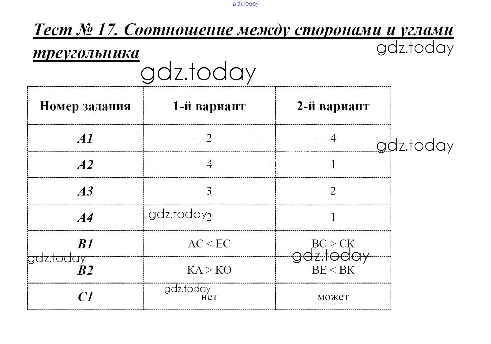 На страницах сайта gdz.today вы найдете учебный и вспомогательный материал, направленный на улучшения знаний школьной программы. ГДЗ - онлайн мир знаний Решение к тестам 17 Контрольно-измерительным материалам (КИМ) по Геометрии для 7 класса Гаврилова ВАКО 2017