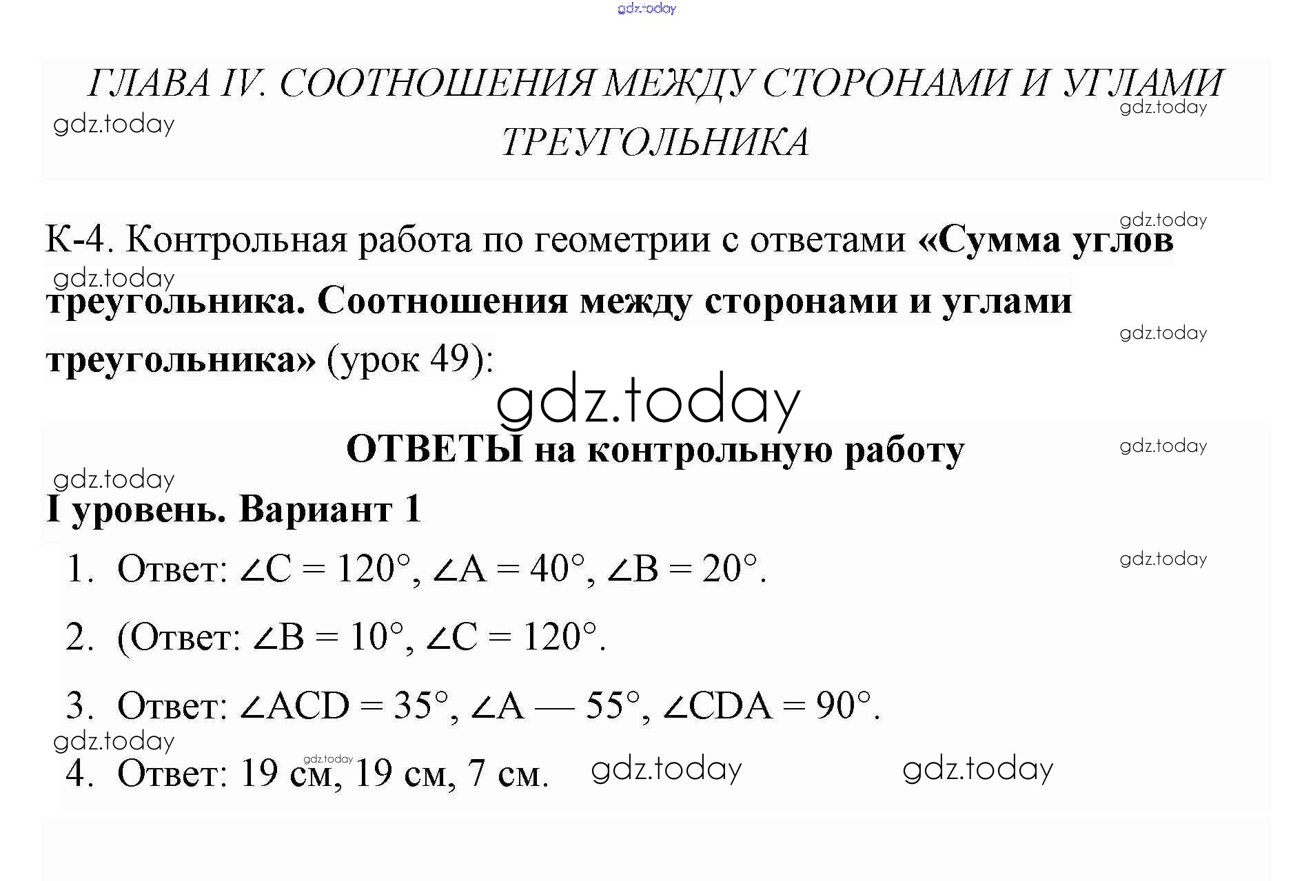 На страницах сайта gdz.today вы найдете учебный и вспомогательный материал, направленный на улучшения знаний школьной программы. ГДЗ - онлайн мир знаний Уровень 1 Решение к контрольной работе №4 (Уровни) 1 Поурочным разработкам по Геометрии для 7 класса Гаврилова ВАКО 2020