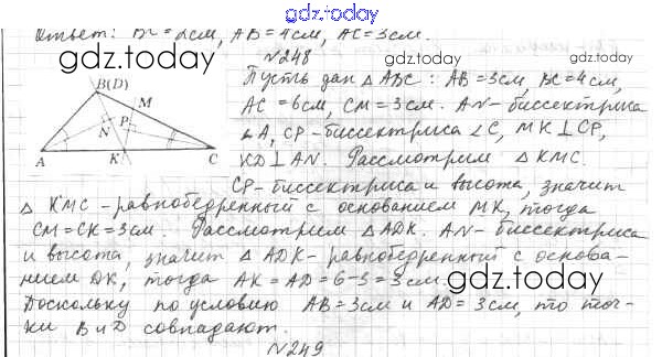 На страницах сайта gdz.today вы найдете учебный и вспомогательный материал, направленный на улучшения знаний школьной программы. ГДЗ - онлайн мир знаний §10. Признаки равнобедренного треугольника Решение к главе 2. Треугольники 248 Учебнику по Геометрии для 7 класса Мерзляк, Полонский Вентана-граф Алгоритм успеха 2017