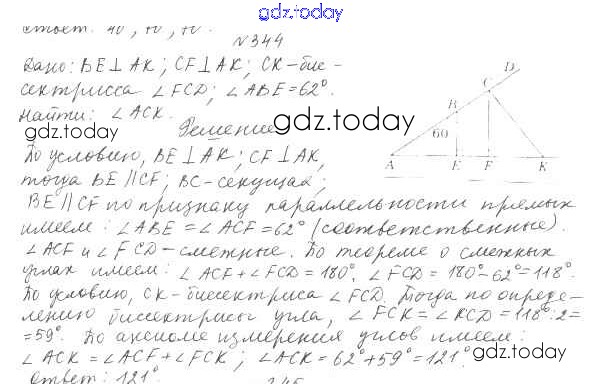 Ответы к §15. Свойства параллельных прямых Решение к главе 3. Параллельные прямые. Сумма углов треугольника 344 Учебнику по Геометрии для 7 класса Мерзляк, Полонский Вентана-граф Алгоритм успеха 2017