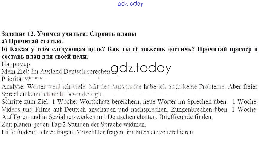 На страницах сайта gdz.today вы найдете учебный и вспомогательный материал, направленный на улучшения знаний школьной программы. ГДЗ - онлайн мир знаний Решение к главе 2. Мои планы 12 Учебнику по Немецкому языку для 7 класса Аверин, Джин Просвещение Horizonte 2016