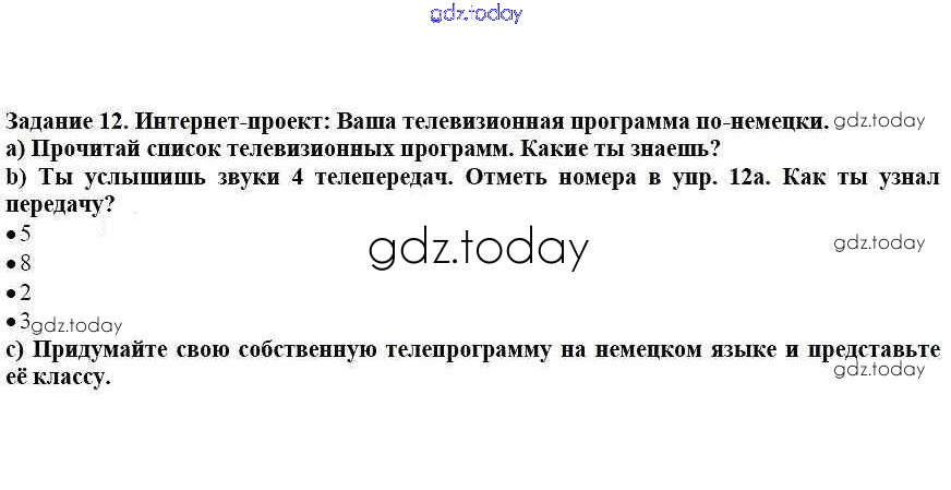 На страницах сайта gdz.today вы найдете учебный и вспомогательный материал, направленный на улучшения знаний школьной программы. ГДЗ - онлайн мир знаний Решение к главе 4. Изображения и звуки 12 Учебнику по Немецкому языку для 7 класса Аверин, Джин Просвещение Horizonte 2016