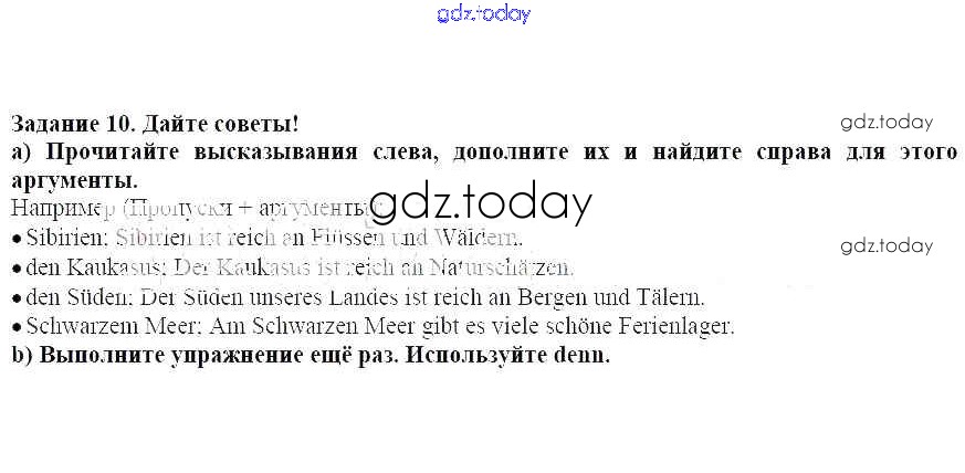 На страницах сайта gdz.today вы найдете учебный и вспомогательный материал, направленный на улучшения знаний школьной программы. ГДЗ - онлайн мир знаний Раздел 2. Что выучишь, то и будешь знать! Решение к главе 1. Что мы называем Родиной 10 Учебнику по Немецкому языку для 7 класса Бим, Садомова Просвещение Академический школьный учебник 2019