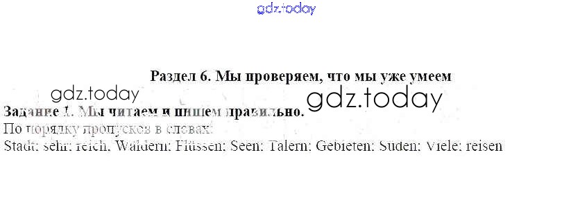 На страницах сайта gdz.today вы найдете учебный и вспомогательный материал, направленный на улучшения знаний школьной программы. ГДЗ - онлайн мир знаний Раздел 6. Мы проверяем, что мы уже умеем Решение к главе 1. Что мы называем Родиной 1 Учебнику по Немецкому языку для 7 класса Бим, Садомова Просвещение Академический школьный учебник 2019