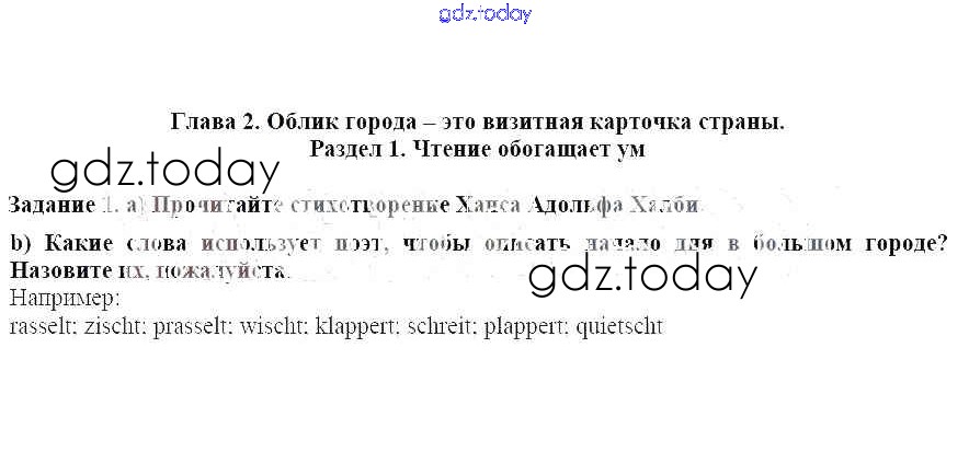 На страницах сайта gdz.today вы найдете учебный и вспомогательный материал, направленный на улучшения знаний школьной программы. ГДЗ - онлайн мир знаний Раздел 1. Чтение обогащает ум Решение к главе 2. Облик города - это визитная карточка страны 1 Учебнику по Немецкому языку для 7 класса Бим, Садомова Просвещение Академический школьный учебник 2019