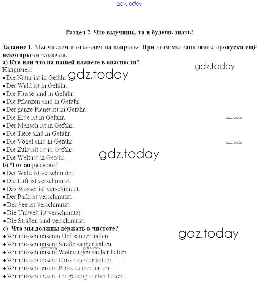 На страницах сайта gdz.today вы найдете учебный и вспомогательный материал, направленный на улучшения знаний школьной программы. ГДЗ - онлайн мир знаний Раздел 2. Что выучишь, то и будешь знать! Решение к главе 5. Защита окружающей среды - самая актуальная проблема на сегодняшний день. Не так ли 1 Учебнику по Немецкому языку для 7 класса Бим, Садомова Просвещение Академический школьный учебник 2019