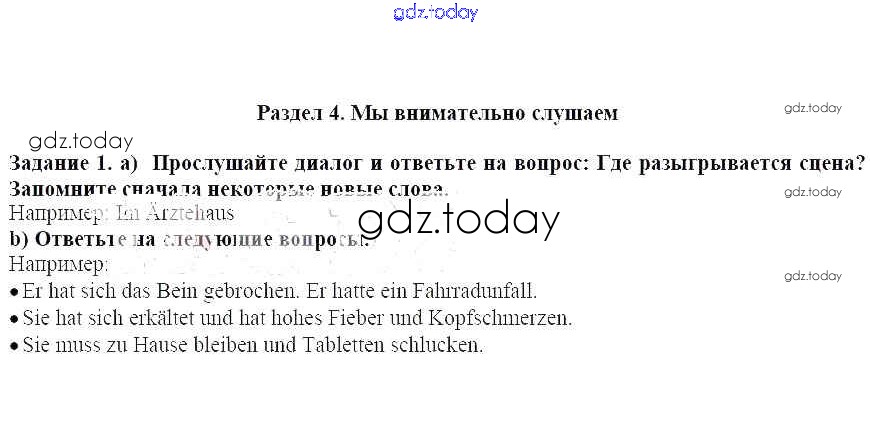 На страницах сайта gdz.today вы найдете учебный и вспомогательный материал, направленный на улучшения знаний школьной программы. ГДЗ - онлайн мир знаний Раздел 4. Мы внимательно слушаем Решение к главе 6. В здоровом теле - здоровый дух 1 Учебнику по Немецкому языку для 7 класса Бим, Садомова Просвещение Академический школьный учебник 2019