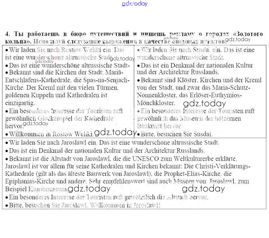 На страницах сайта gdz.today вы найдете учебный и вспомогательный материал, направленный на улучшения знаний школьной программы. ГДЗ - онлайн мир знаний Слово - серебро, молчание – золото. Но не во время изучения иностранного языка! Решение к главе 2. Облик города – визитная карточка страны 4 Рабочей тетради по Немецкому языку для 7 класса Бим, Садомова Просвещение 2012