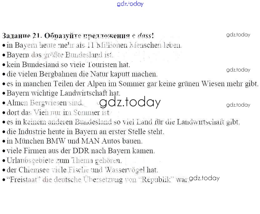 На страницах сайта gdz.today вы найдете учебный и вспомогательный материал, направленный на улучшения знаний школьной программы. ГДЗ - онлайн мир знаний Урок 13. Бавария Решение к главе 3. Мы отправляемся в южную Германию! 21 Учебнику по Немецкому языку для 7 класса Радченко, Хебелер Дрофа Alles Klar! 2020