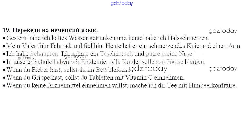 На страницах сайта gdz.today вы найдете учебный и вспомогательный материал, направленный на улучшения знаний школьной программы. ГДЗ - онлайн мир знаний Решение к главе 4. Здоровье 19 Рабочей тетради по Немецкому языку для 7 класса Радченко, Глушак Просвещение Wunderkinder 2012