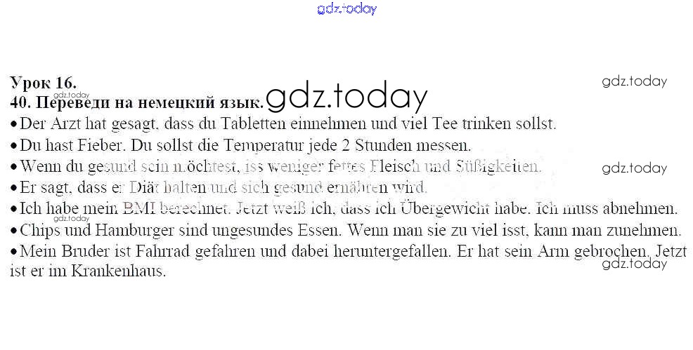 На страницах сайта gdz.today вы найдете учебный и вспомогательный материал, направленный на улучшения знаний школьной программы. ГДЗ - онлайн мир знаний Решение к главе 4. Здоровье 40 Рабочей тетради по Немецкому языку для 7 класса Радченко, Глушак Просвещение Wunderkinder 2012