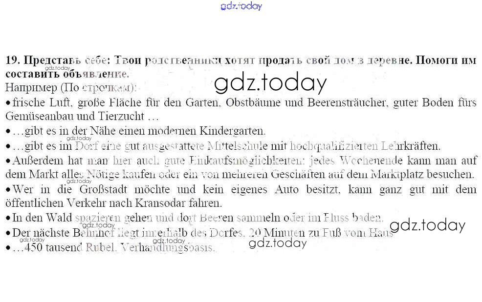 На страницах сайта gdz.today вы найдете учебный и вспомогательный материал, направленный на улучшения знаний школьной программы. ГДЗ - онлайн мир знаний Решение к главе 5. Город и деревня 19 Рабочей тетради по Немецкому языку для 7 класса Радченко, Глушак Просвещение Wunderkinder 2012