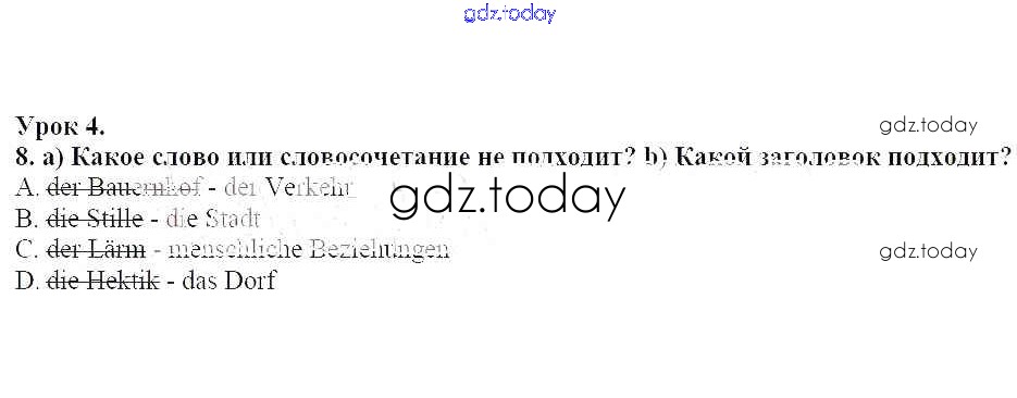 На страницах сайта gdz.today вы найдете учебный и вспомогательный материал, направленный на улучшения знаний школьной программы. ГДЗ - онлайн мир знаний Решение к главе 5. Город и деревня 8 Рабочей тетради по Немецкому языку для 7 класса Радченко, Глушак Просвещение Wunderkinder 2012