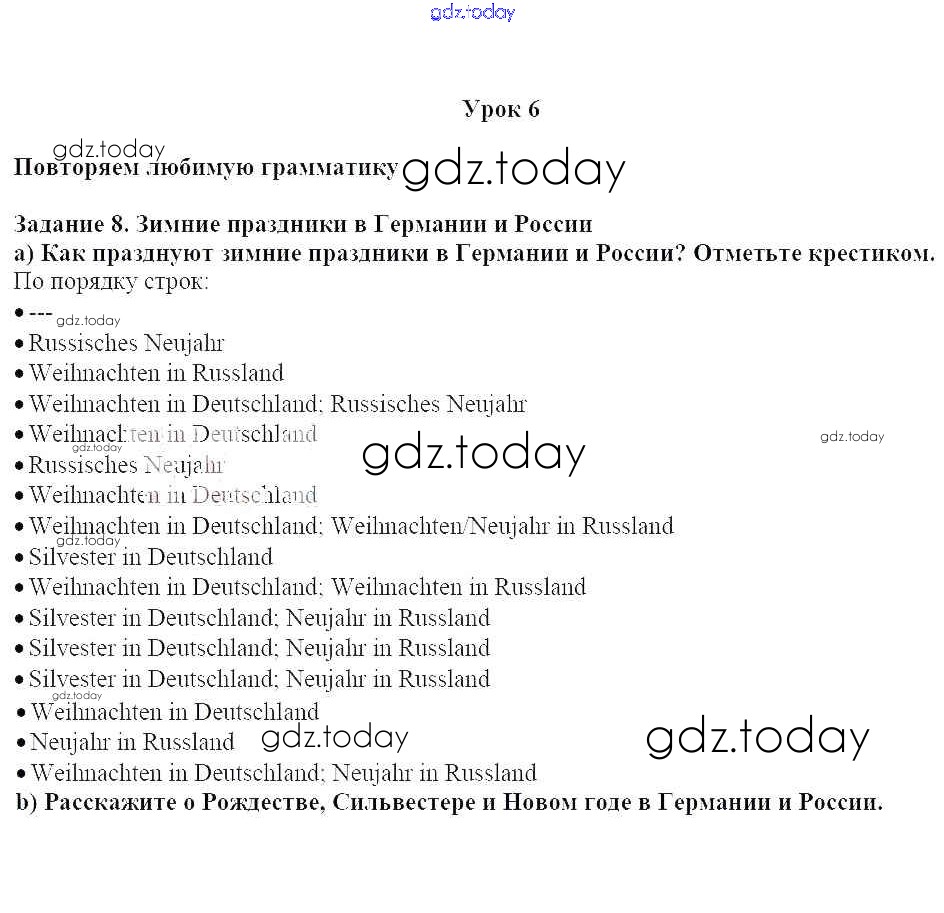 На страницах сайта gdz.today вы найдете учебный и вспомогательный материал, направленный на улучшения знаний школьной программы. ГДЗ - онлайн мир знаний Уроки 1-7 Решение к главе 2. Зимние праздники в Германии и в России 8 Учебнику по Немецкому языку для 7 класса Радченко, Конго Просвещение Wunderkinder 2016