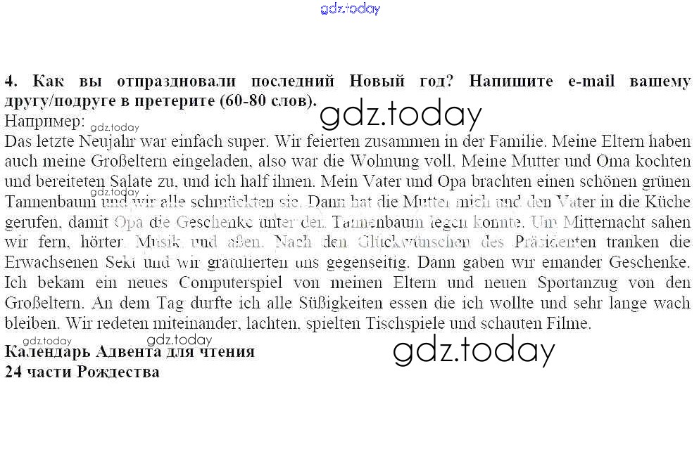 На страницах сайта gdz.today вы найдете учебный и вспомогательный материал, направленный на улучшения знаний школьной программы. ГДЗ - онлайн мир знаний Урок 8 Решение к главе 2. Зимние праздники в Германии и в России 4 Учебнику по Немецкому языку для 7 класса Радченко, Конго Просвещение Wunderkinder 2016