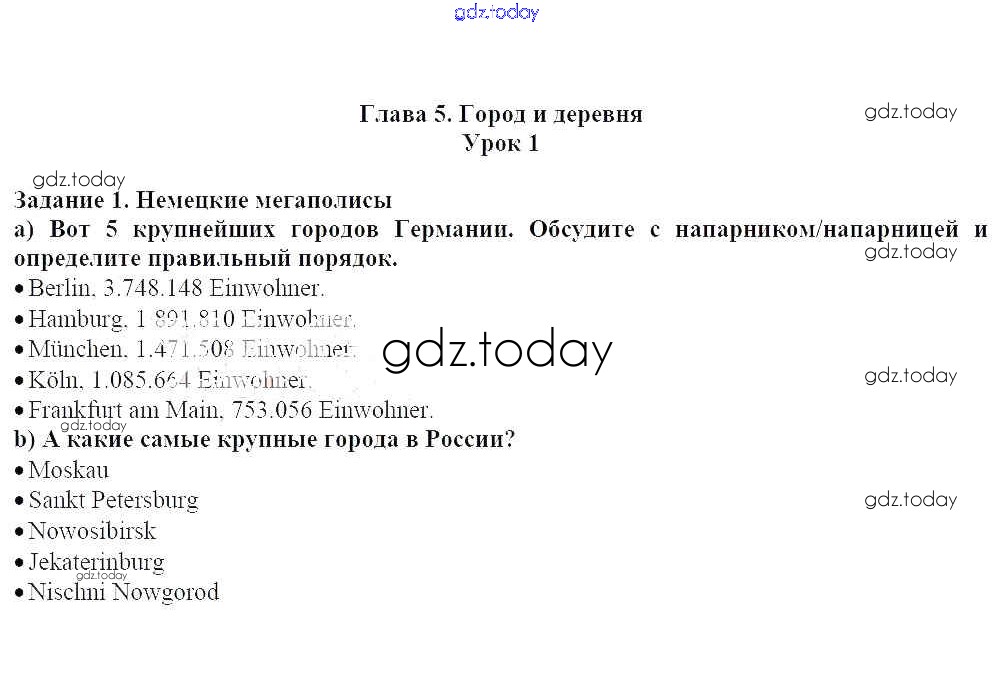 На страницах сайта gdz.today вы найдете учебный и вспомогательный материал, направленный на улучшения знаний школьной программы. ГДЗ - онлайн мир знаний Уроки 1-8 Решение к главе 5. Город и деревня 1 Учебнику по Немецкому языку для 7 класса Радченко, Конго Просвещение Wunderkinder 2016