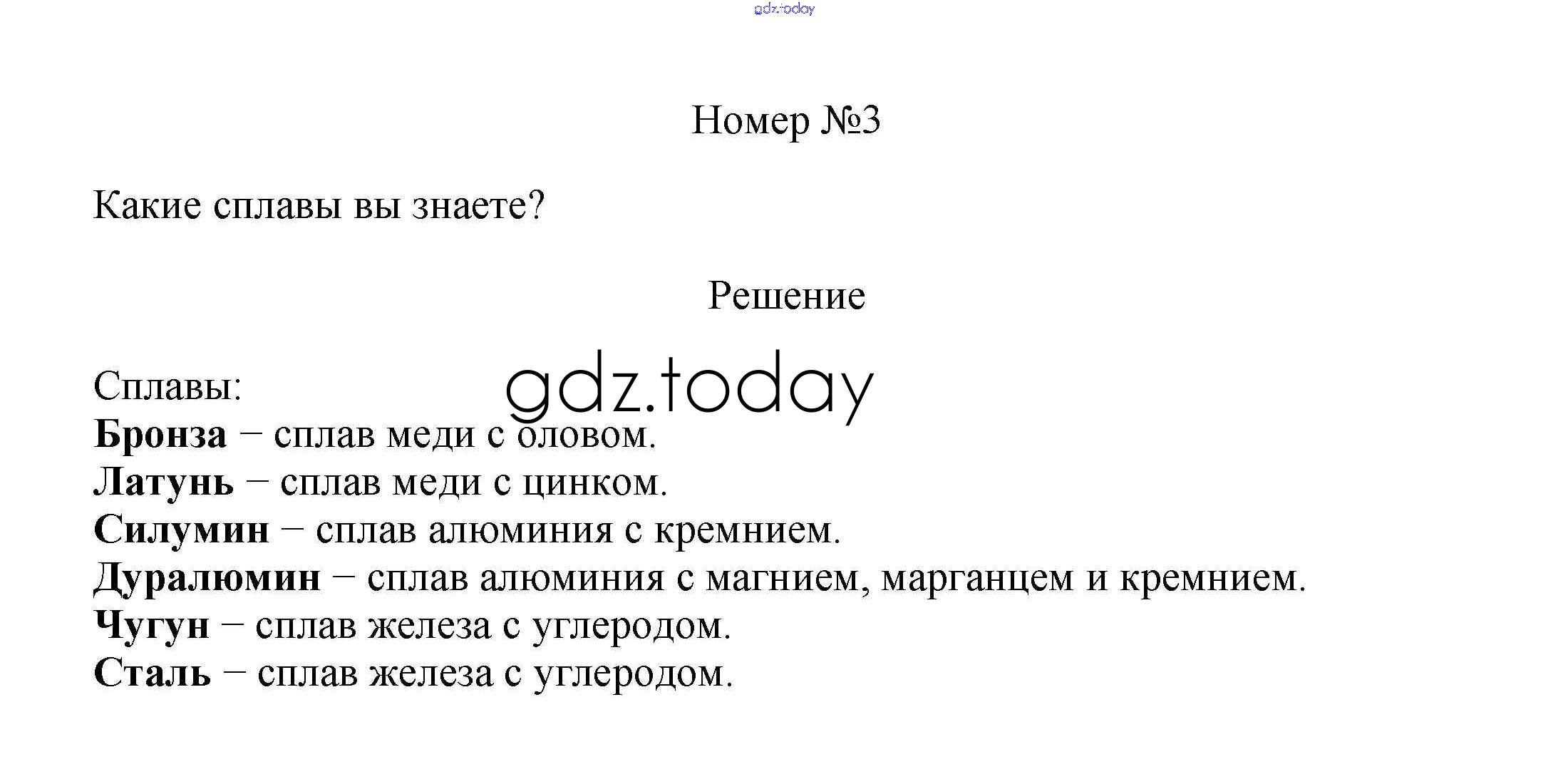 На страницах сайта gdz.today вы найдете учебный и вспомогательный материал, направленный на улучшения знаний школьной программы. ГДЗ - онлайн мир знаний Вопросы и задания Решение к §24. Металлы и сплавы 3 Учебнику по Химии для 7 класса Еремин, Дроздов Дрофа 2020