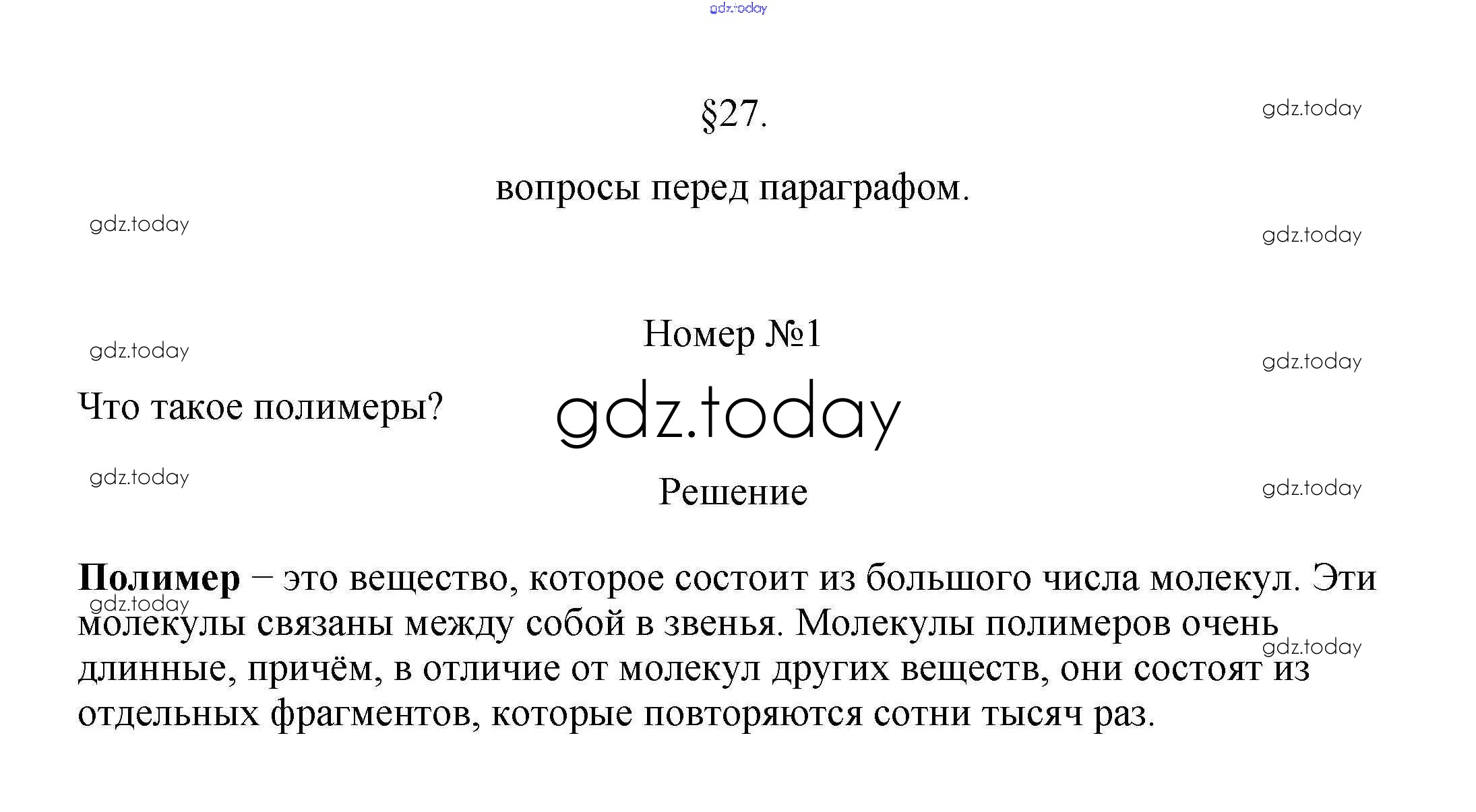 На страницах сайта gdz.today вы найдете учебный и вспомогательный материал, направленный на улучшения знаний школьной программы. ГДЗ - онлайн мир знаний Вопросы перед параграфом Решение к §27. Полимеры 1 Учебнику по Химии для 7 класса Еремин, Дроздов Дрофа 2020