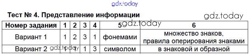 На страницах сайта gdz.today вы найдете учебный и вспомогательный материал, направленный на улучшения знаний школьной программы. ГДЗ - онлайн мир знаний Решение к тестам Тест №4. Представление информации Контрольно-измерительным материалам (КИМ) по Информатике для 7 класса Масленикова ВАКО 2017