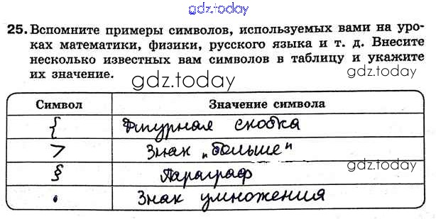 На страницах сайта gdz.today вы найдете учебный и вспомогательный материал, направленный на улучшения знаний школьной программы. ГДЗ - онлайн мир знаний Решение к заданиям 25 Рабочей тетради по Информатике для 7 класса Босова Бином 2018