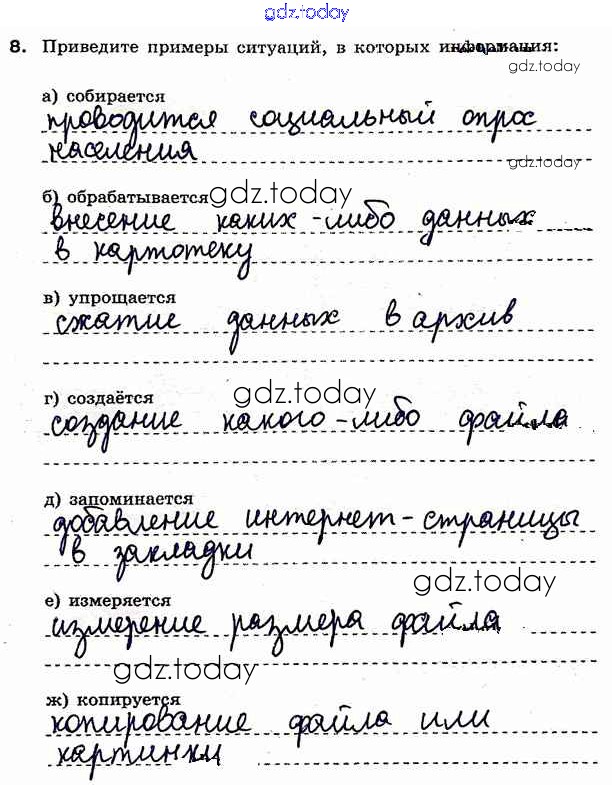 На страницах сайта gdz.today вы найдете учебный и вспомогательный материал, направленный на улучшения знаний школьной программы. ГДЗ - онлайн мир знаний Решение к заданиям 8 Рабочей тетради по Информатике для 7 класса Босова Бином 2018