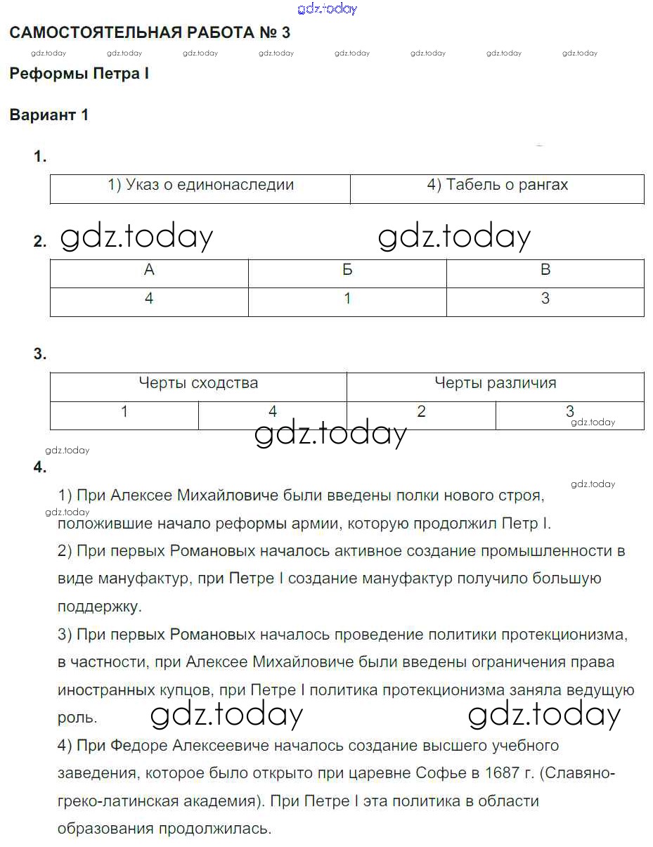 На страницах сайта gdz.today вы найдете учебный и вспомогательный материал, направленный на улучшения знаний школьной программы. ГДЗ - онлайн мир знаний СР-4. Социально-экономическое развитие России в первой четверти XVIII века Решение к теме Россия в первой четверти XVIII века Вариант 1 Рабочей тетради по Истории России для 7 класса Акиньшина, Артасов Национальное образование 2013