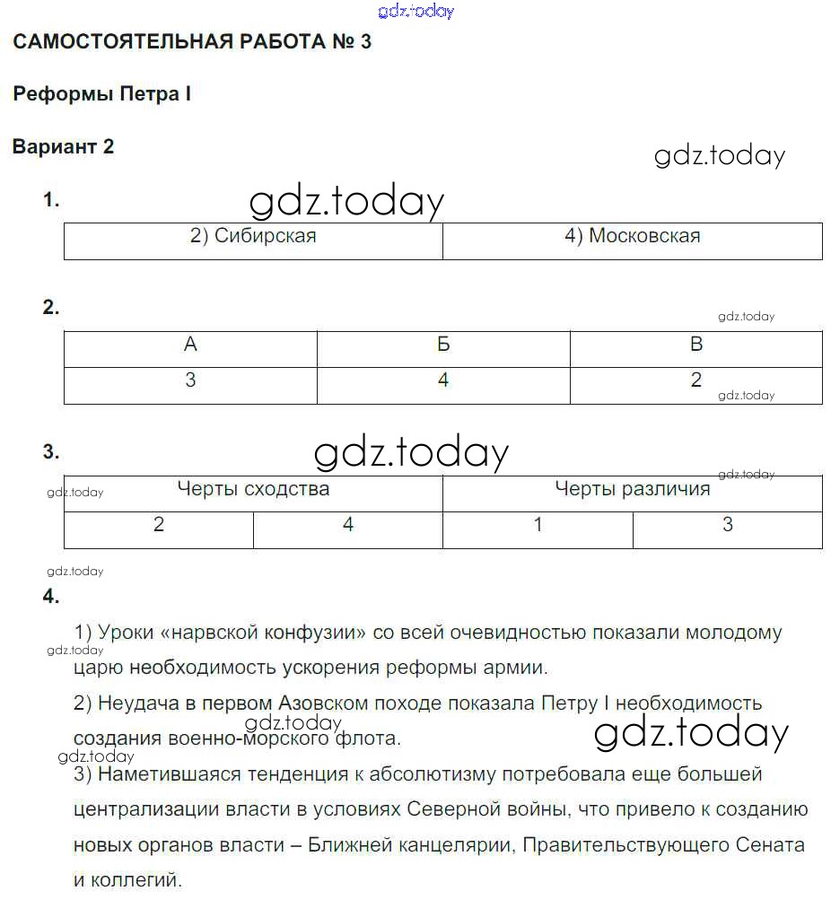 На страницах сайта gdz.today вы найдете учебный и вспомогательный материал, направленный на улучшения знаний школьной программы. ГДЗ - онлайн мир знаний СР-4. Социально-экономическое развитие России в первой четверти XVIII века Решение к теме Россия в первой четверти XVIII века Вариант 2 Рабочей тетради по Истории России для 7 класса Акиньшина, Артасов Национальное образование 2013