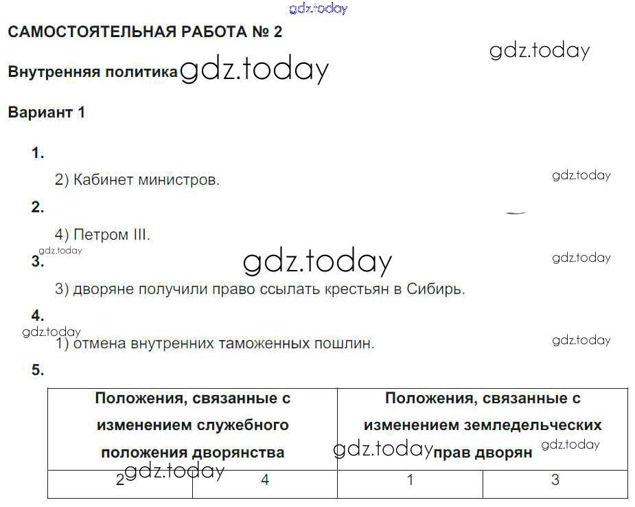 На страницах сайта gdz.today вы найдете учебный и вспомогательный материал, направленный на улучшения знаний школьной программы. ГДЗ - онлайн мир знаний СР-2. Внутренняя политика Решение к теме Российская империя в 1725-1762 гг Вариант 1 Рабочей тетради по Истории России для 7 класса Акиньшина, Артасов Национальное образование 2013