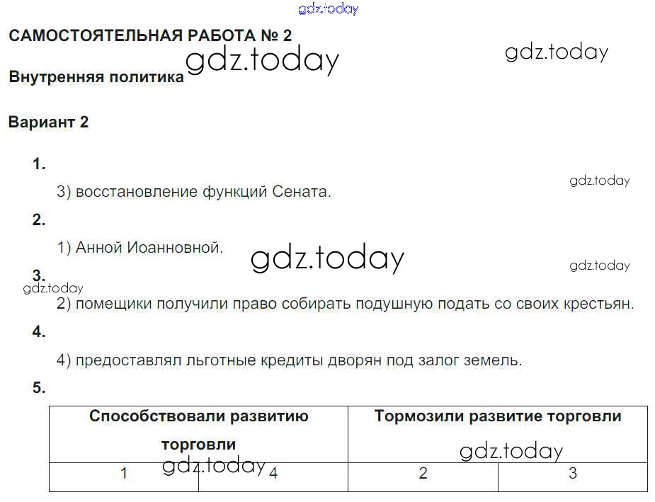На страницах сайта gdz.today вы найдете учебный и вспомогательный материал, направленный на улучшения знаний школьной программы. ГДЗ - онлайн мир знаний СР-2. Внутренняя политика Решение к теме Российская империя в 1725-1762 гг Вариант 2 Рабочей тетради по Истории России для 7 класса Акиньшина, Артасов Национальное образование 2013
