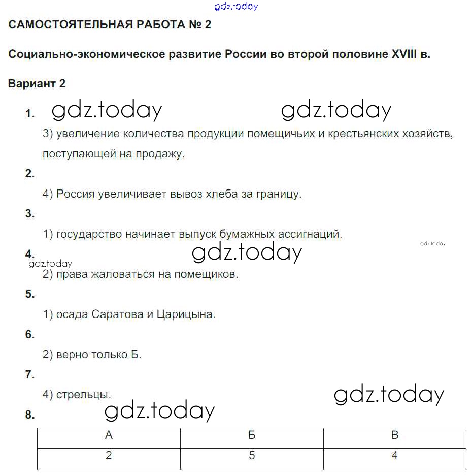 Ответы к СР-2. Социально-экономическое развитие России во второй половине XVIII века Решение к теме Российская империя в 1762-1801 гг Вариант 2 Рабочей тетради по Истории России для 7 класса Акиньшина, Артасов Национальное образование 2013