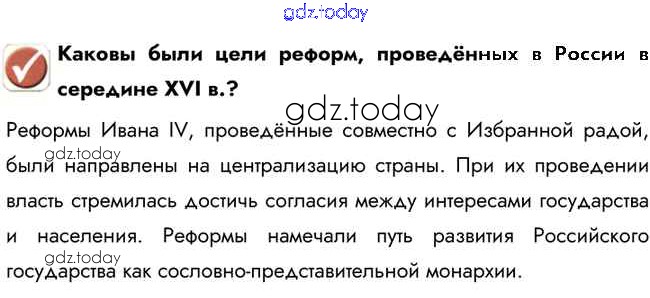 На страницах сайта gdz.today вы найдете учебный и вспомогательный материал, направленный на улучшения знаний школьной программы. ГДЗ - онлайн мир знаний Вопрос в начале параграфа §6 1 Учебнику по Истории России для 7 класса Арсентьев, Данилов Просвещение 2016