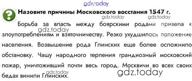 На страницах сайта gdz.today вы найдете учебный и вспомогательный материал, направленный на улучшения знаний школьной программы. ГДЗ - онлайн мир знаний Вопросы §6 стр.44 Учебнику по Истории России для 7 класса Арсентьев, Данилов Просвещение 2016