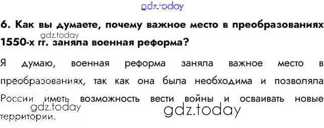 На страницах сайта gdz.today вы найдете учебный и вспомогательный материал, направленный на улучшения знаний школьной программы. ГДЗ - онлайн мир знаний Вопросы и задания §6 6 Учебнику по Истории России для 7 класса Арсентьев, Данилов Просвещение 2016