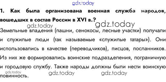 На страницах сайта gdz.today вы найдете учебный и вспомогательный материал, направленный на улучшения знаний школьной программы. ГДЗ - онлайн мир знаний Вопросы и задания Народы России во второй половине XVI в. 1 Учебнику по Истории России для 7 класса Арсентьев, Данилов Просвещение 2016