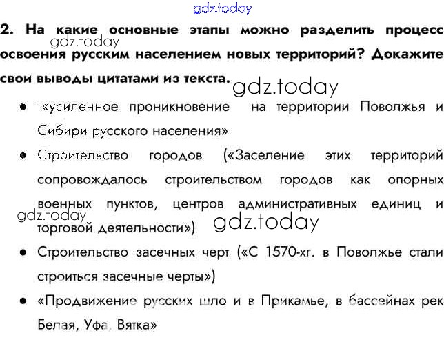 На страницах сайта gdz.today вы найдете учебный и вспомогательный материал, направленный на улучшения знаний школьной программы. ГДЗ - онлайн мир знаний Вопросы и задания Народы России во второй половине XVI в. 2 Учебнику по Истории России для 7 класса Арсентьев, Данилов Просвещение 2016