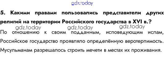 На страницах сайта gdz.today вы найдете учебный и вспомогательный материал, направленный на улучшения знаний школьной программы. ГДЗ - онлайн мир знаний Вопросы и задания Народы России во второй половине XVI в. 5 Учебнику по Истории России для 7 класса Арсентьев, Данилов Просвещение 2016