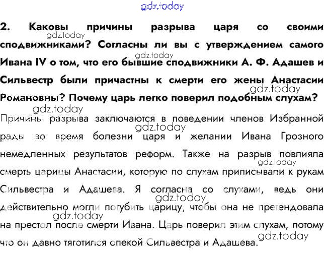 На страницах сайта gdz.today вы найдете учебный и вспомогательный материал, направленный на улучшения знаний школьной программы. ГДЗ - онлайн мир знаний Вопросы и задания §10 2 Учебнику по Истории России для 7 класса Арсентьев, Данилов Просвещение 2016