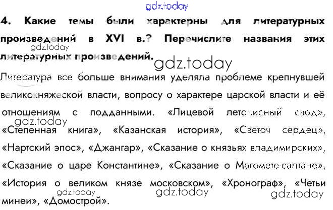 На страницах сайта gdz.today вы найдете учебный и вспомогательный материал, направленный на улучшения знаний школьной программы. ГДЗ - онлайн мир знаний Вопросы и задания Культура и повседневная жизнь народов России в XVI в. 4 Учебнику по Истории России для 7 класса Арсентьев, Данилов Просвещение 2016