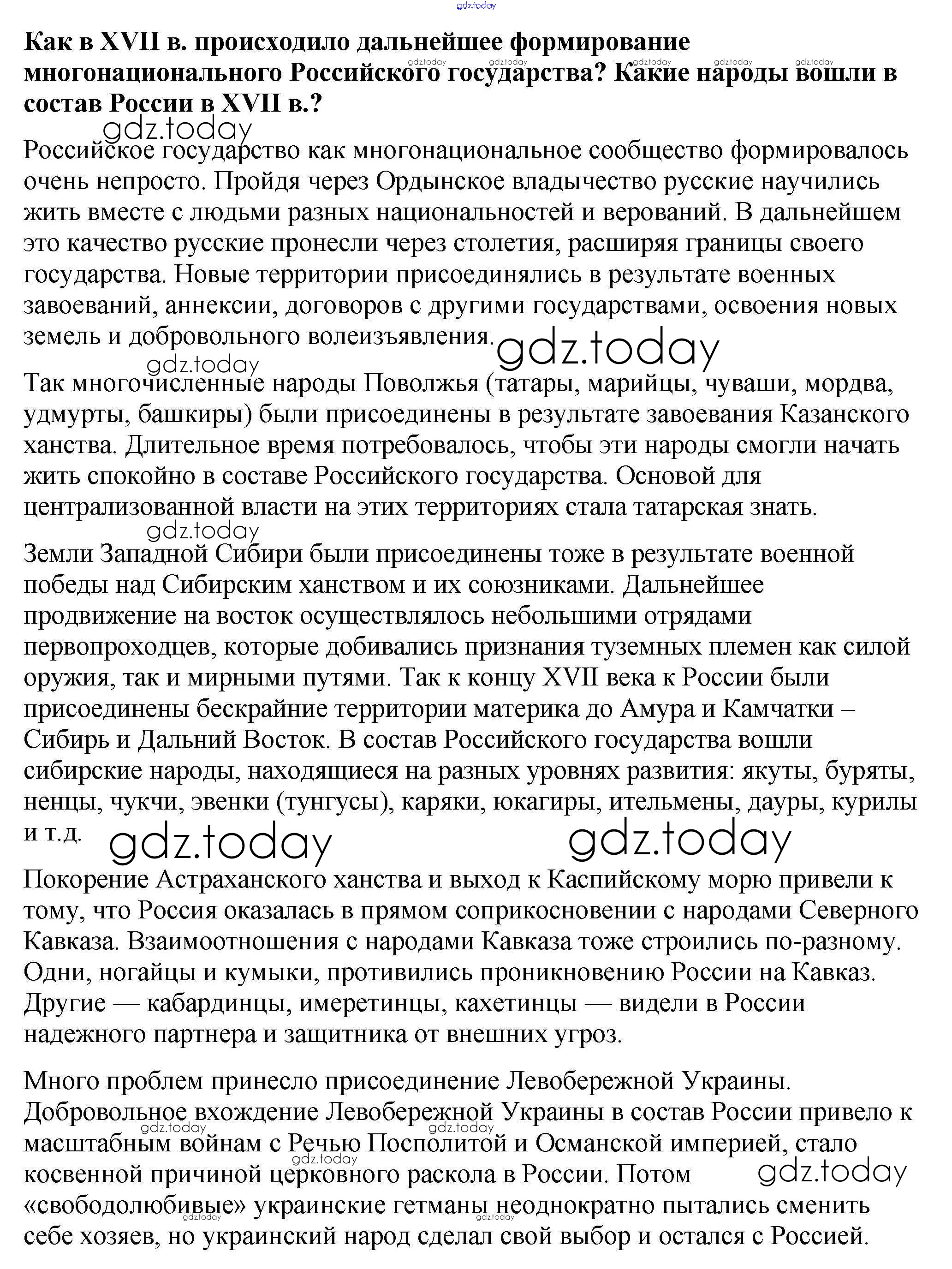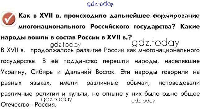На страницах сайта gdz.today вы найдете учебный и вспомогательный материал, направленный на улучшения знаний школьной программы. ГДЗ - онлайн мир знаний Вопрос в начале параграфа Народы России в XVII в. 1 Учебнику по Истории России для 7 класса Арсентьев, Данилов Просвещение 2016