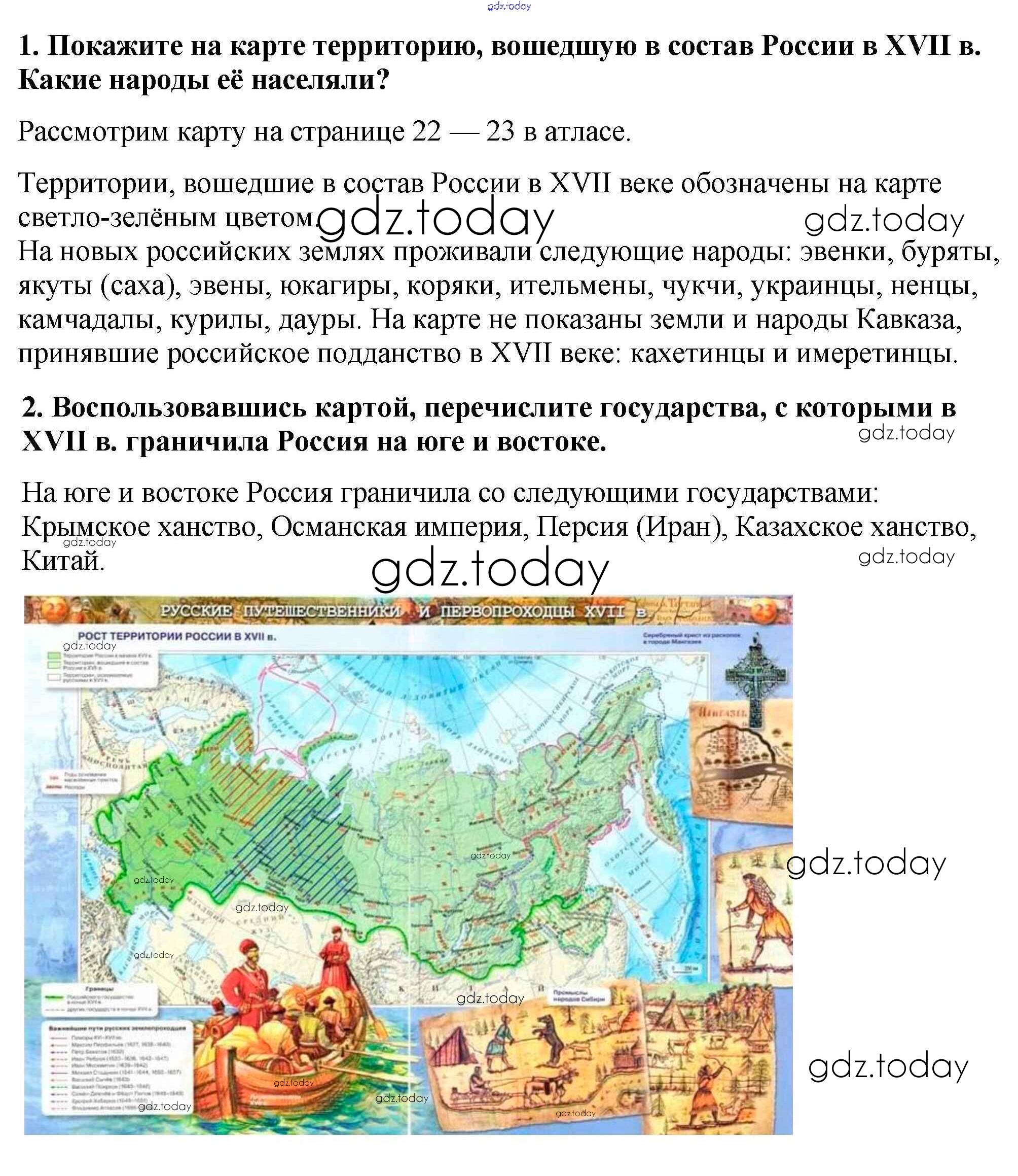 На страницах сайта gdz.today вы найдете учебный и вспомогательный материал, направленный на улучшения знаний школьной программы. ГДЗ - онлайн мир знаний Работаем с картой Народы России в XVII в. стр.86 Учебнику по Истории России для 7 класса Арсентьев, Данилов Просвещение 2016